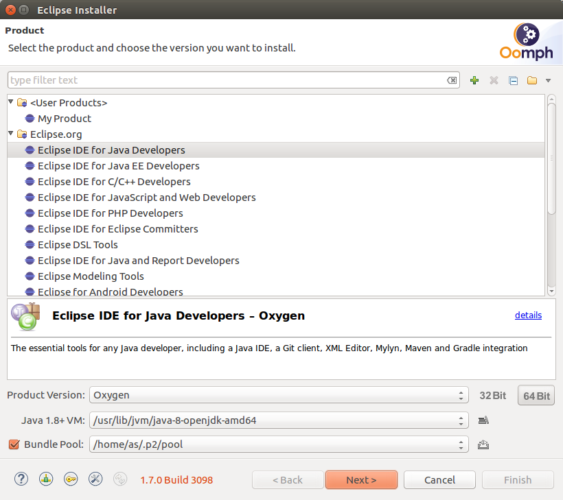 Normalerweise startet der Installer im “Simple Mode”, über das Hamburger-Menü kann man in den “Advanced Mode” umschalten. In beiden Fällen wählt man zuerst eine passende Grund-IDE aus, zum Beispiel “Eclipse IDE for Java Developers” und installiert sie. Im Gegensatz zur traditionellen Eclipse-Installation werden die dafür benötigten Plugins und Features nicht direkt im Installationsverzeichnis gespeichert, sondern in einem globalen “Bundle Pool”. Das heißt die Installation weiterer Eclipse-Instanzen erfolgt ohne neuen Download und belegt weniger Plattenplatz. Nach der Installation startet der Installer die neue IDE. Diese neue IDE enthält schon die notwendigen Plugins für Oomph.